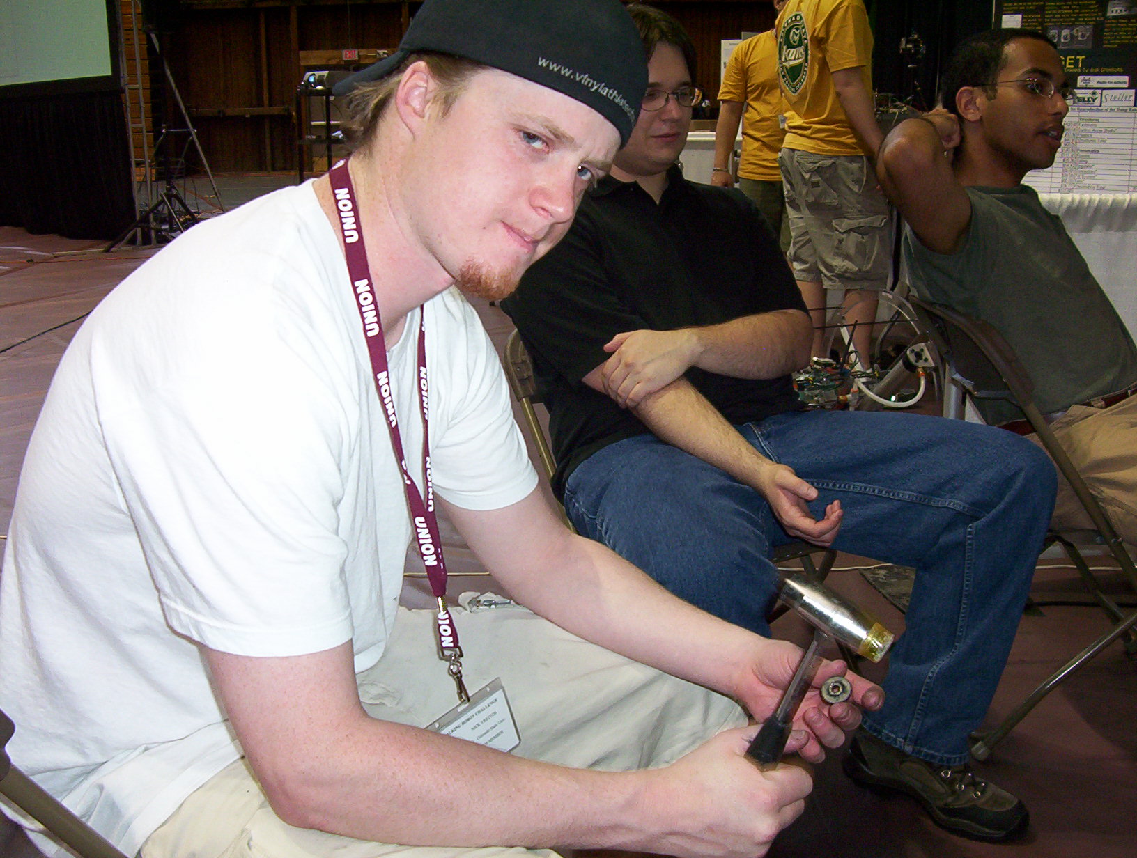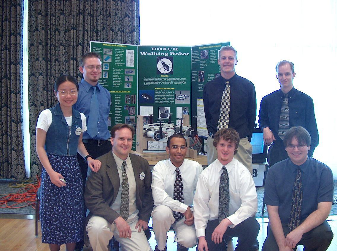 040505 - Aw, jeez... where to begin?? Well, we're done with the project, presented at E-Days and successfully competed in the SAE Walking Machine Challenge in Schenectady, New York. The above picture is the one and only existing snapshot of the entire Roach team. From left to right, that's Tran, Eric (with Eyes Closed), Me (kneeling), Liam, Nick, Chris (standing), Joel and Ryan (sitting).