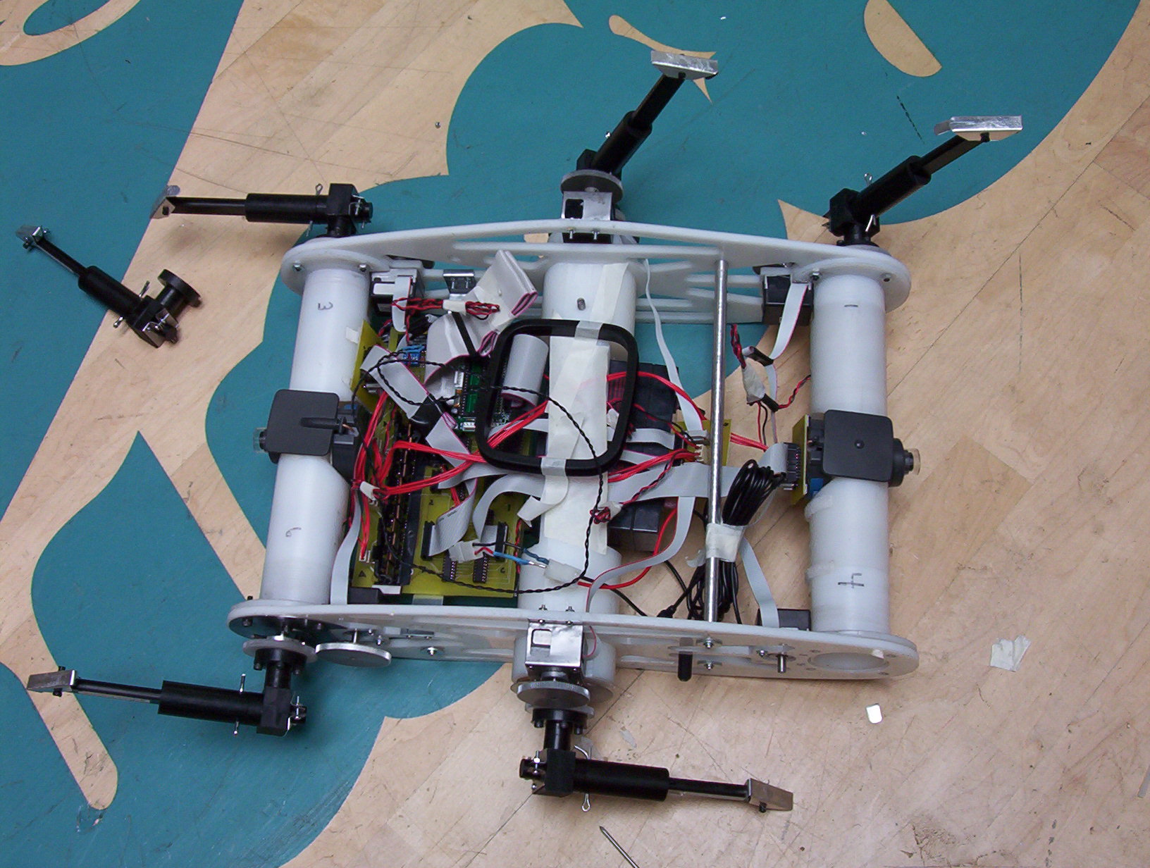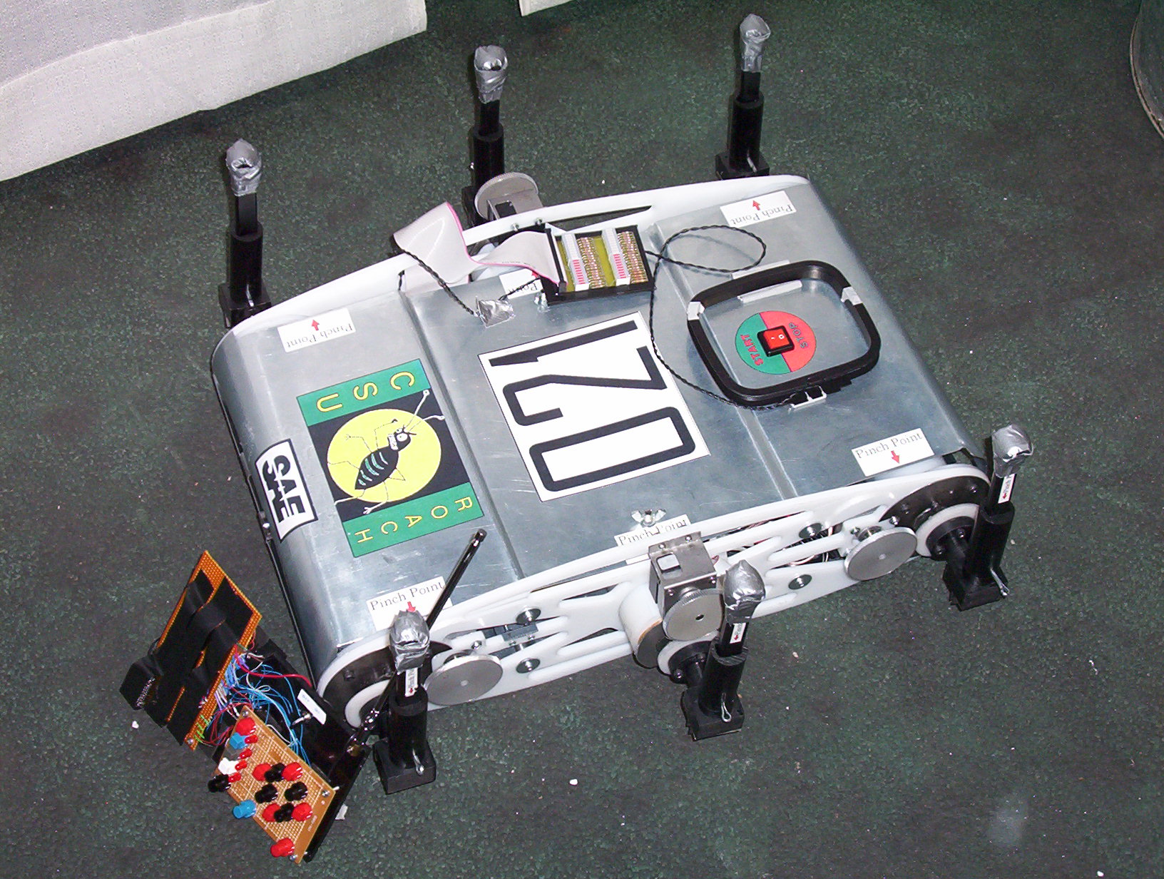 And Roach lived again!! Once we completed the slalom (just 17 seconds behind Mike III) our morale improved greatly. We decided also that it was time to start making a few design modifications such as shortening and locking the legs, removing the cameras and placing the antenna on the outside of the chassis.
