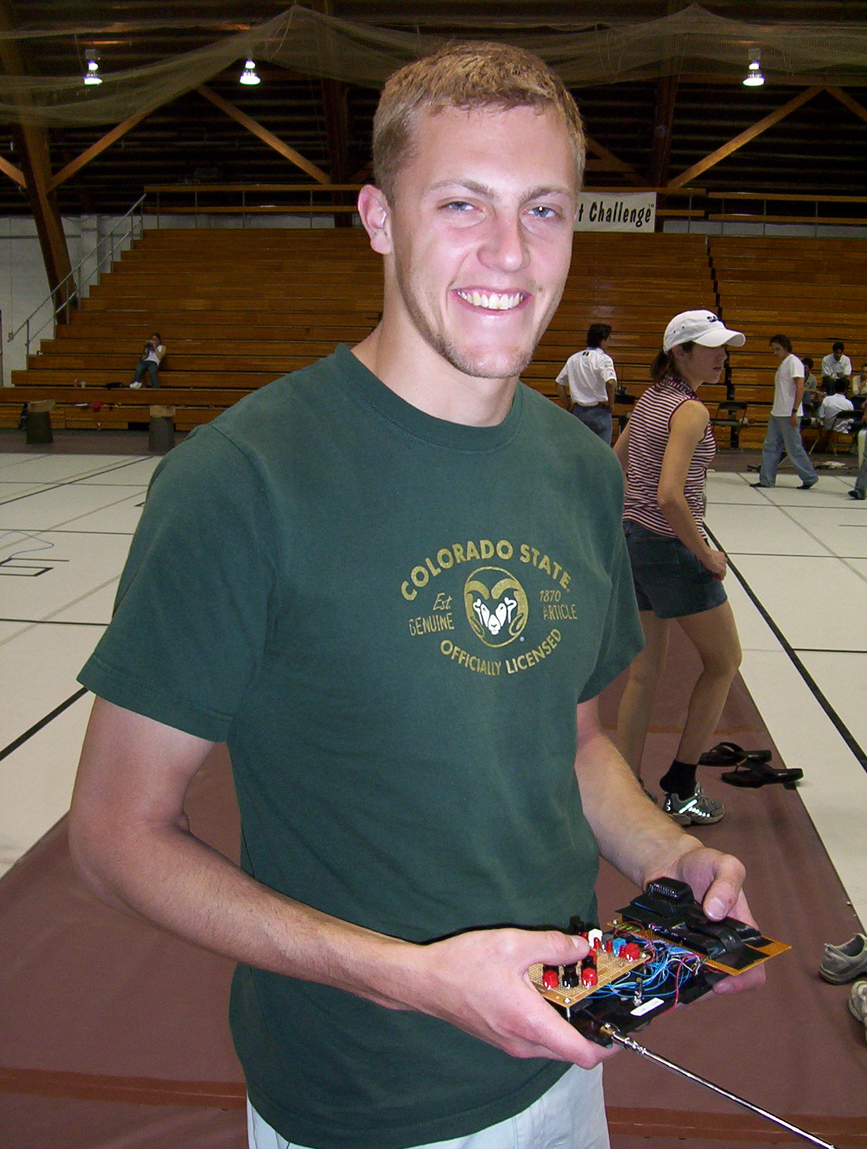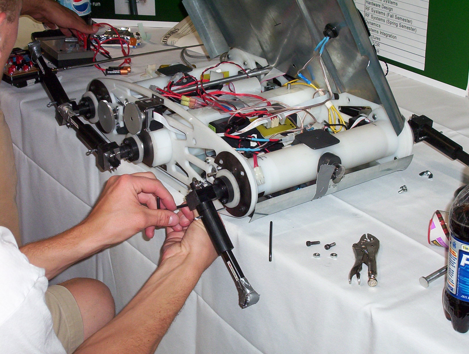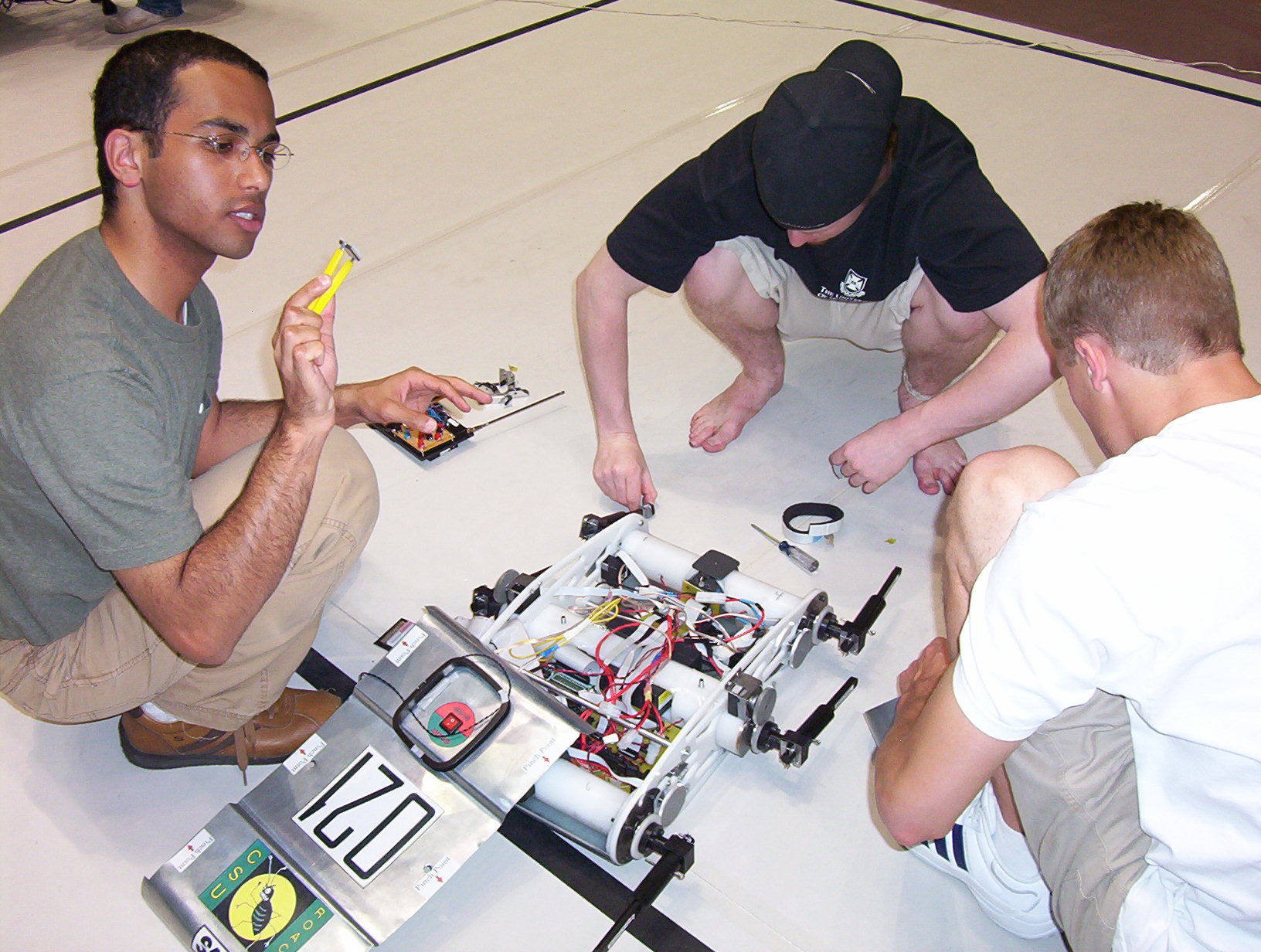 Weds: This is what Roach looked like the night before we packed it up and brought it to New York. It wasn't working all day so we worked on it until we barely got it walking. Four of us with luggage packed tightly into my Firebird and we had a long trip down to Denver where we crashed on the floor of one of the other teams' member's house. By the time it came to board the plane at 6:00am, we were quite tired and grouchy.